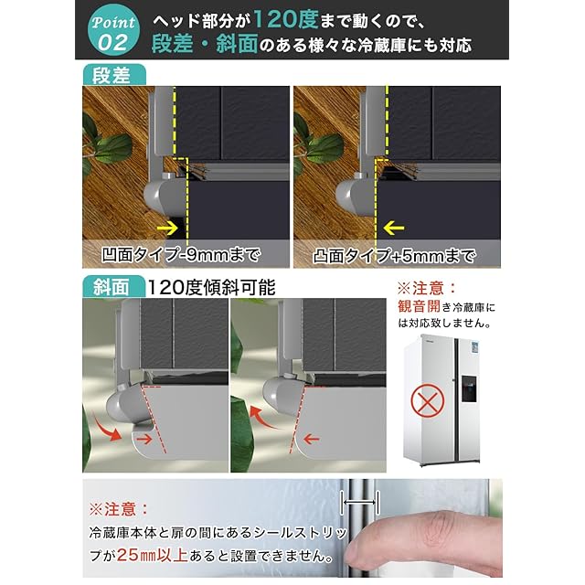 ✅【段差・斜面にも設置が可能】冷蔵庫 ロック は凹型ドアフレームで-9㎜、凸型ドアフレームで+5㎜まで設置が可能です。また、冷蔵庫のドア側に設置する部分は、120度回転するので斜面にも設置可能です。こどもやペットのいたずら防止、地震対策におすすめです。