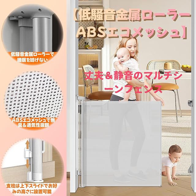 【Dzannc】ロール式ベビーゲート – 自動巻き取り&安全ロック搭載、豊富なサイズ展開、ネジ&粘着取付対応、ペット(犬・猫)対応、日語説明書付、室内安全対策 (ホワイト, 97*140cm) | ascend