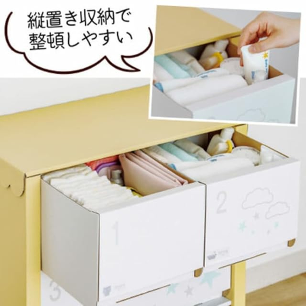 ②最適容量&”お世話ごと収納”で出し入れしやすい…必要なものがまるっと入る!すっきり縦型収納でモノを探す時間をカット。おむつ替え・沐浴・お着替え・おでかけ・おもちゃと、1つの引き出しに1つのお世話グッズをまとめられて管理しやすい