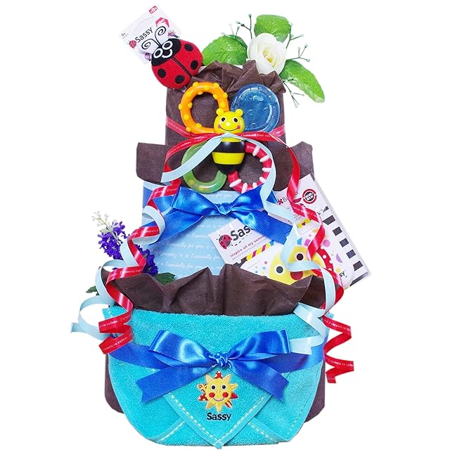 Sassy サッシー ラブリーシュシュ おむつケーキ 3段 出産祝い ギフトセット 男の子 女の子 おもちゃ タオル チャームバンド 人気 amazon 2段 (パンパーステープタイプSサイズ) アクア | ascend