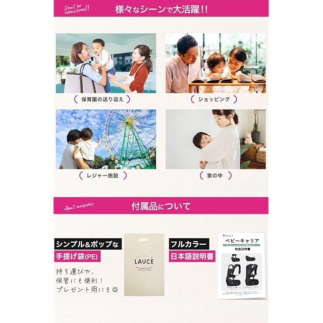 【特徴】本メーカー製品をご購入いただく皆さまの抱っこライフに少しでもお役に立て出来るようイメージ、デザインさせていただきました。 ①優しさパッド付き補助ベルト*パッド付補助ベルトは当ブランドだけ! ②U字型滑り止め付きシート 【簡単・便利な子育てグッズ】軽量モデルで持ち運びも楽々、 取り外しも簡単で時間をかけず手軽に使えるベビーキャリアです。抱っこにお困りのママやパパ達もしっかりサポートします。 シートのフロント、サイド部分には収納ポケットを充実させ利便性だけでなく機能性も兼ね備えました。 上部キャリア部分は簡単に取り外せ、「抱っこひも」「ヒップシート」とお使い分け出来ますので、家の中やちょっとそこまでの外出から旅行やショッピング、交通移動、送り迎えなど様々なシーンで活躍いたします。お手頃価格なのでキャリアタイプのセカンド用としても大人気のモデルです。