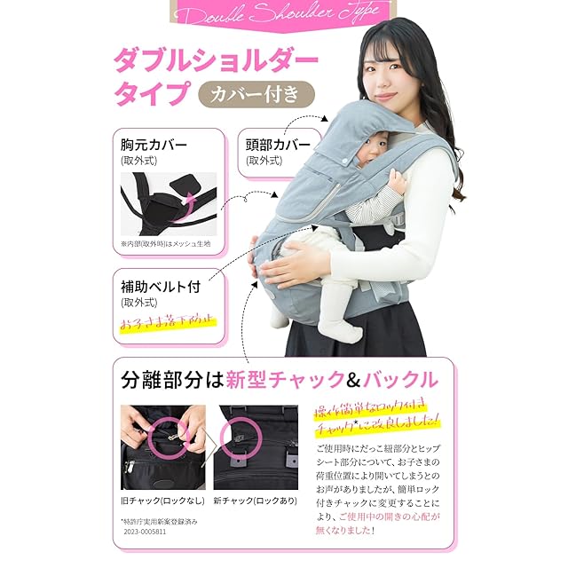 【特徴】本メーカー製品をご購入いただく皆さまの抱っこライフに少しでもお役に立て出来るようイメージ、デザインさせていただきました。 ①優しさパッド付き補助ベルト*パッド付補助ベルトは当ブランドだけ! ②U字型滑り止め付きシート 【簡単・便利な子育てグッズ】軽量モデルで持ち運びも楽々、 取り外しも簡単で時間をかけず手軽に使えるベビーキャリアです。抱っこにお困りのママやパパ達もしっかりサポートします。 シートのフロント、サイド部分には収納ポケットを充実させ利便性だけでなく機能性も兼ね備えました。 上部キャリア部分は簡単に取り外せ、「抱っこひも」「ヒップシート」とお使い分け出来ますので、家の中やちょっとそこまでの外出から旅行やショッピング、交通移動、送り迎えなど様々なシーンで活躍いたします。お手頃価格なのでキャリアタイプのセカンド用としても大人気のモデルです。※現在ご覧の選択商品は「カバー無し」となります。違うシリーズのパーツ追加や変更はできませんのでご注意ください。