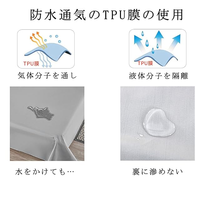 防水の構造:裏の面は防水のTPU材料を採用しており、裏に滲めないように水など液体を分けます。また、一定な通気性を持って、表面の材料を合わせて吸湿通気で心地良い睡眠を提供しています。