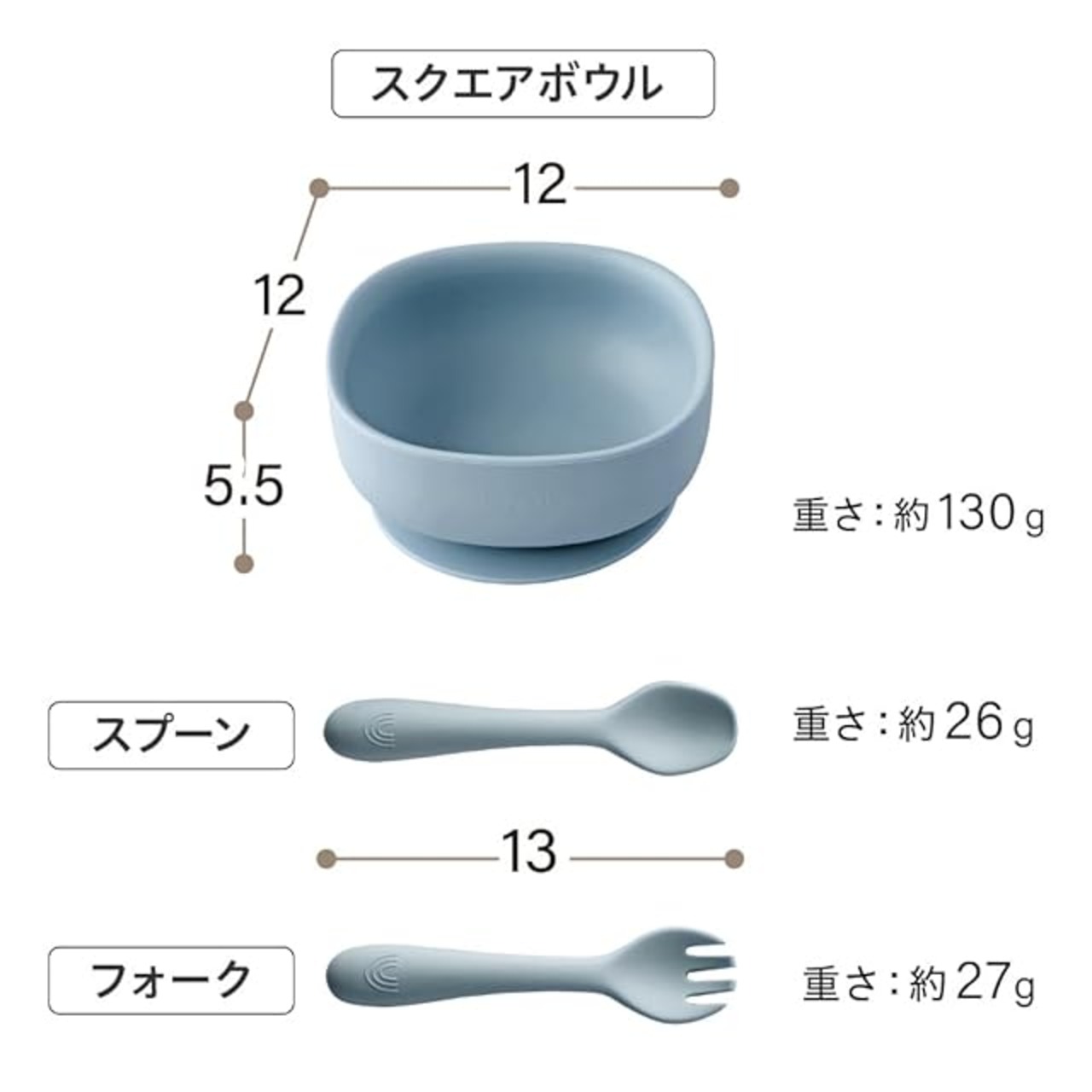 スクエアボウル:W12×D12×H5.5cm、スプーン:H13cm、フォーク:H13cm