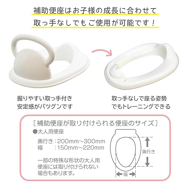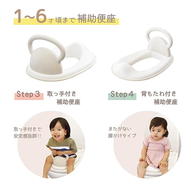STEP2 補助便座として(1才6ヶ月頃から6才頃まで)。 取っ手付き補助便座、腰かけタイプ補助便座と2通りの使い方が出来ます。取っ手を外して取っ手なしタイプでもご使用頂けます。