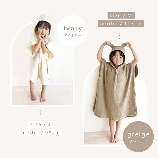 [atRise] 【おふろ/プール/水あそびに◎】スッと吸収 4重ガーゼ 綿100% タオルポンチョ バスローブ ベビー キッズ くま耳 フード付きタオル 赤ちゃん バスタオル 男の子 女の子 ワンオペ お風呂 湯上りタオル (S, グレージュ) | ascend