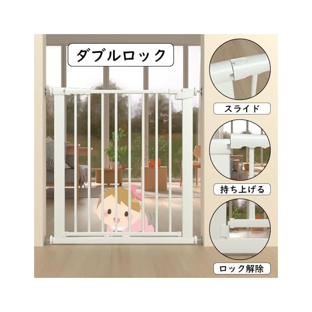 「ダブルロック」赤ちゃんにとって少し難しいダブルロックですが、大人は片手で簡単に開閉することができます。大型荷物を持っても、片手で簡単にロックを解除できるベビーゲート ペットゲートです。