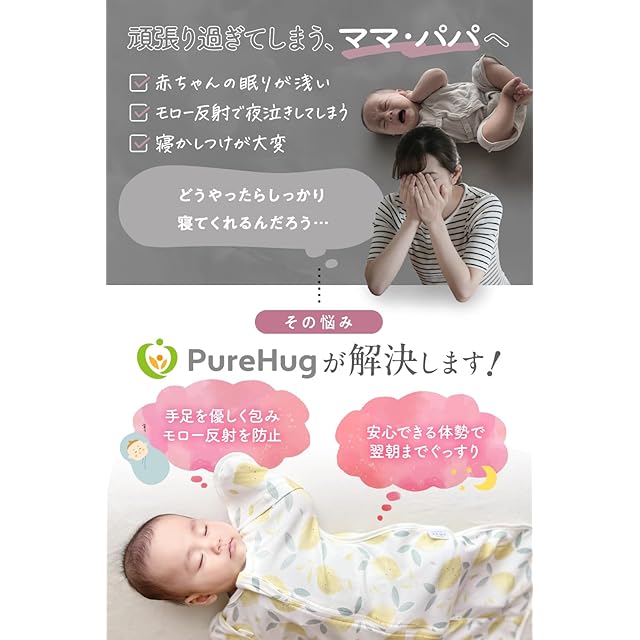 【 モロー反射を防ぎ、夜泣き対策に最適 】モロー反射とは、新生児が反射的に腕や脚を広げたり、抱きつくような動きをする自然な反応です。ただ、この動きで赤ちゃん自身が驚いて泣いてしまったり、眠りそうだったのに目を覚ましてしまったりと、モロー反射に悩んでいるママ・パパも多いと思います。PureHugは全身を優しく包み込むことで赤ちゃんにママのお腹にいるような安心感を与えてモロー反射を防止し、良質な睡眠 へと導きます。