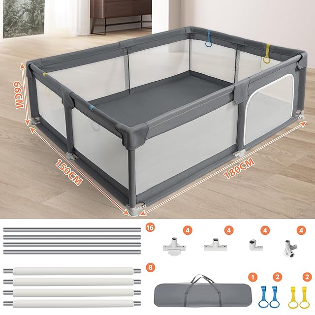 【超大型ベビーサークル】サイズ:150*180*66 cm、色:ダークグレー、本体材料:エコオックスフォード布+合金鋼管+ABSコネクタ、製品重量:約4.8 kg、適用年齢:生後5ヶ月~4歳頃