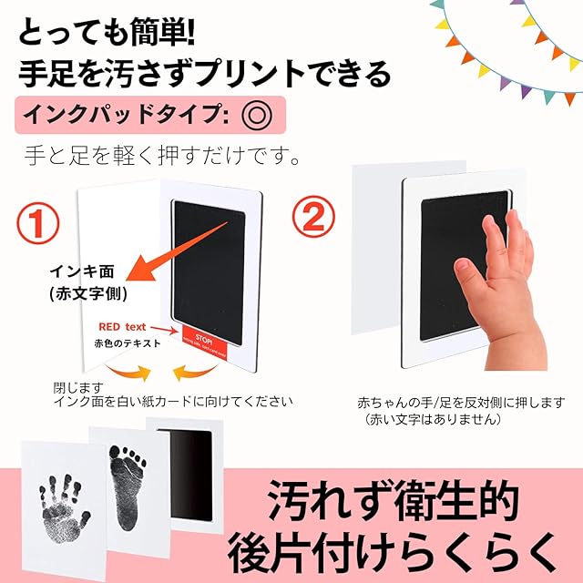 クリーンタッチのインクパッドで、お子さまの手や足に直接インクをつけずに手形や足形をとることができます。