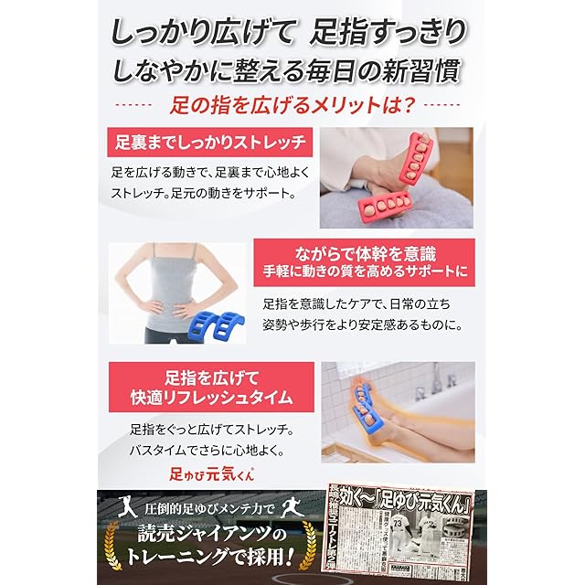 足ゆび元気くんを装着することで、普段の生活では鍛えにくい筋肉にアプローチして足指を広げます。 足指を広げることで身体のバランスが整いやすくなります。