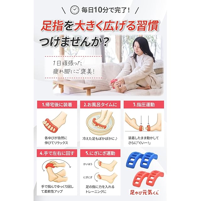 足指げんきくんを装着し、足指をニギニギと前後などに動かして、解放感を味わいましょう。 最初は馴染まない箇所もあるかもしれませんが、使用するにつれてジャストフィットします。「
