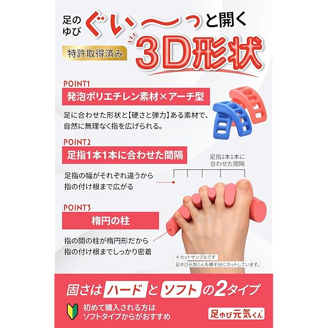 硬さと弾力性のある発泡ポリエチレン素材で足指をしっかり広げます。 表面はエンボス加工を施しており、滑りにくい素材です。