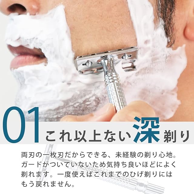 【オンリーワンの深剃り】ヒゲソリの気持ち良さ、楽しさの新発見。一枚刃だから出来る「感動深剃り」。最初はコツがいりますが、慣れると自由自在にシェービング可能です。シェービングの際、刃を肌に当てる角度は約20~30度が理想です。刃を立てると肌を切る可能性がございます。慣れないうちは慎重にゆっくりと剃ってください。