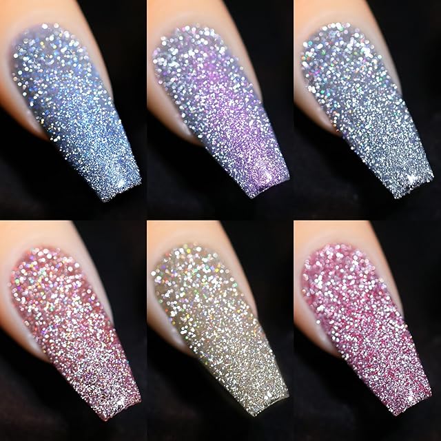 BORN PRETTY 10ml リフレクティブ グリッター ジェル ポリッシュ 6 本セット。キラキラと輝くグリッターが入ったゴージャスなマニキュアです。 ホログラフィックの輝きの正確なタッチとの繊細なバランスが、太陽と光の中で特別な個性を生み出します。2 つの魅力的な効果、自然光の通常効果と点滅するディスコ効果。 日常生活だけでなく、さまざまなパーティーにも最適です。 魅力的で異なる効果があなたを驚かせます。 光や角度によって見え方が違う!