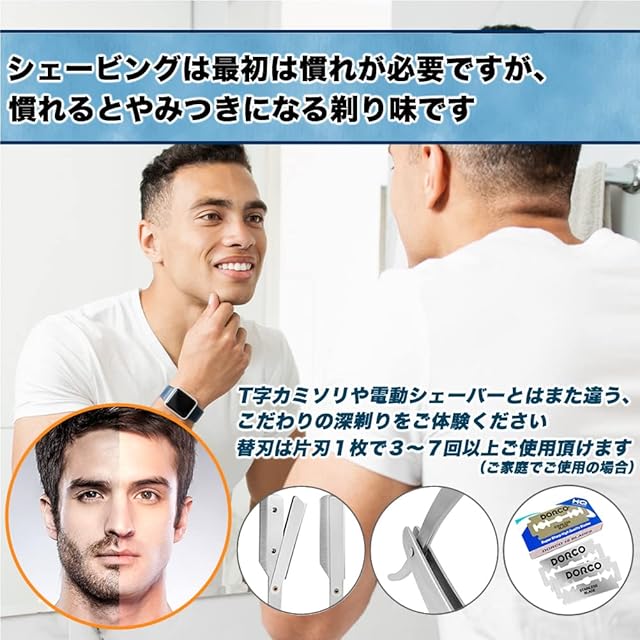 【T字カミソリ以上】5枚刃や6枚刃より肌への負担が少ない。かみそり負けもしにくいですが、切れ味は抜群です。とても丈夫なステンレス製ですので、長く愛用頂ける一品です。