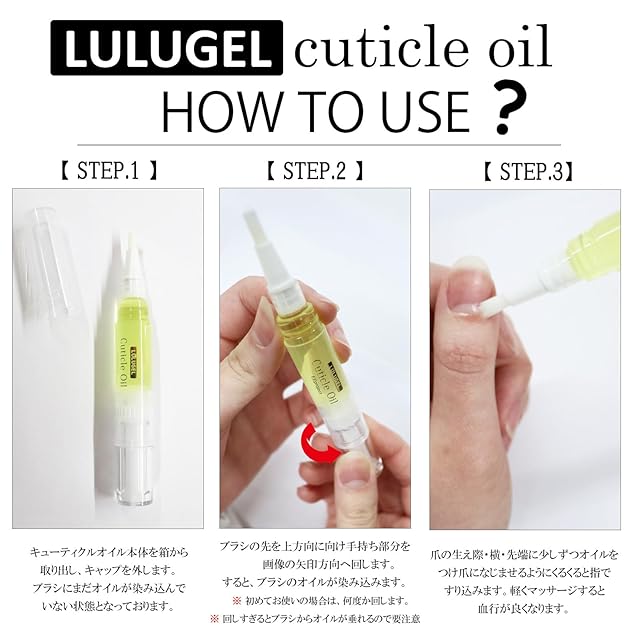 LULUGEL キューティクルオイルってどんな効果があるの? 皮膚内部への浸透が非常に良く爪がしっかり保湿されるので爪が割れたりささくれができたり二枚爪になったりとトラブルを防ぐことができる効果が期待できます。 油分や栄養が補給されることで爪の成長を促す効果も! さらに、乾燥で硬くなりやすい甘皮がオイルによって柔らかくなるので、ネイルの仕上がりもより美しくなります。
