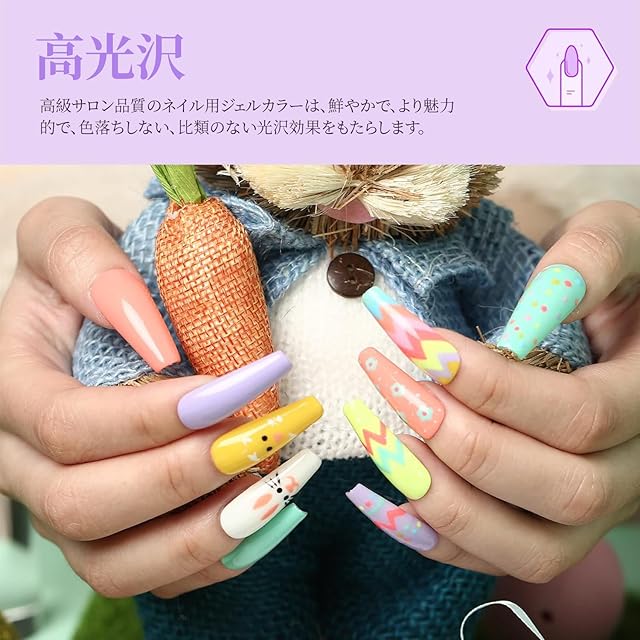 光沢UP、発色抜群:ジェルブラシで塗りやすいよう、やや硬めのテクスチャーを採用、なめらかな柔らかいテクスチャーを採用、絶妙な透け感と奥行き感でうるうる、ぷるぷるカラージェルネイルに