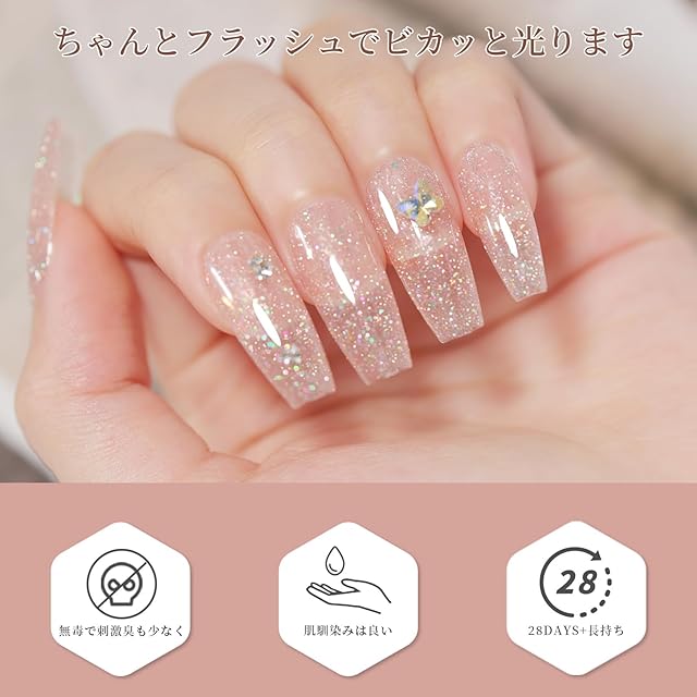 【塗りやすい】塗ると爪の表面にすっと広がって馴染みます。ラメ入りジェルネイルの色はとても綺麗で、初心者でも使いやすいテクスチャーです。優れた密着力と耐久性を備えています。美しいネイルを長時間キープし、持続的な輝きを提供します。
