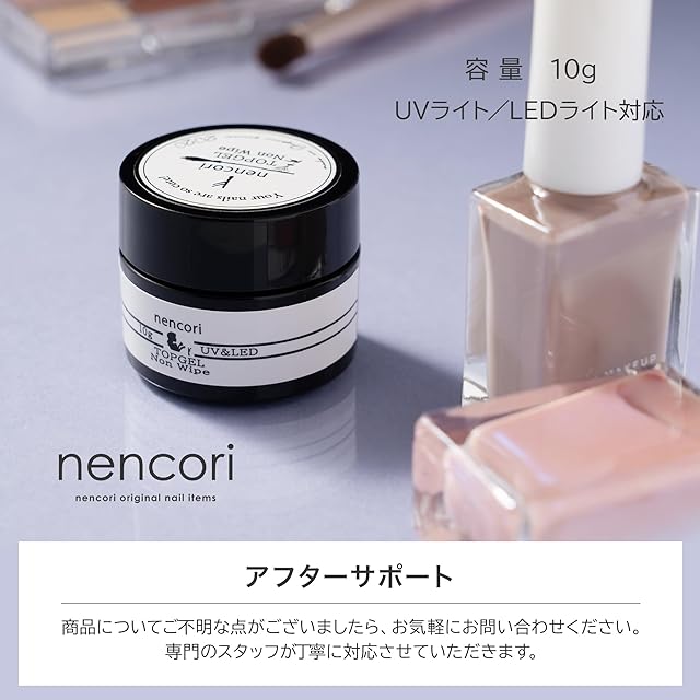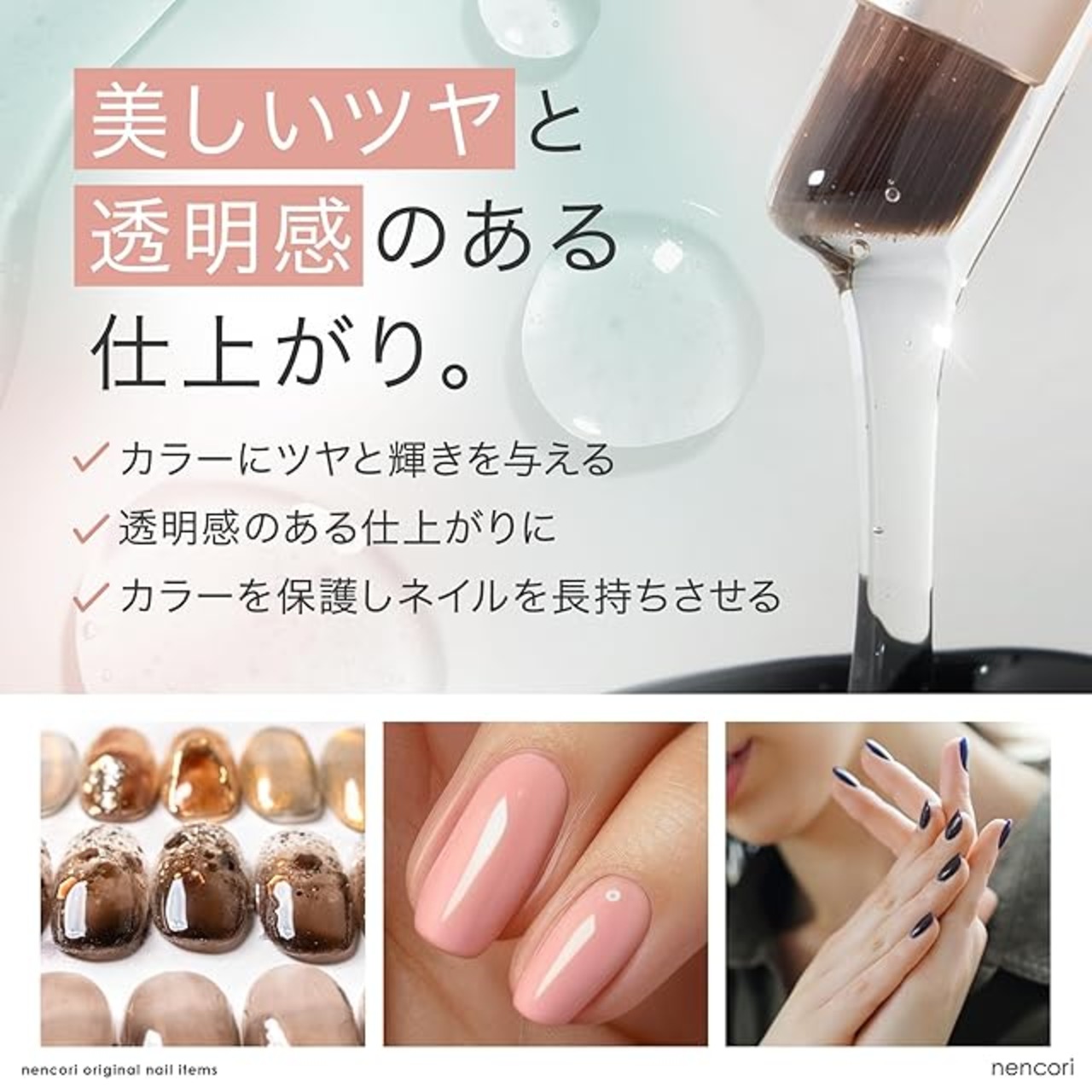 【商品仕様】○ノンサンディングベースジェル&ノンワイプトップジェル ○容量:各10g ○UVライト/LEDライト対応 ○用法:爪に適量を塗布し、LED/UVライトを照射して下さい ○照射の目安:LED20~30秒 UV50~80秒 ○全成分:アクリレーツコポリマー、酢酸イソボルニル、メタクリル酸ヒドロキシプロピル、(酢酸/酪酸)セルロース、マイクロクリスタリンワックス、トリメチルベンゾイルフェニルホスフィン酸エチル ○ブランド:nencori <日本製/化粧品認可取得済>