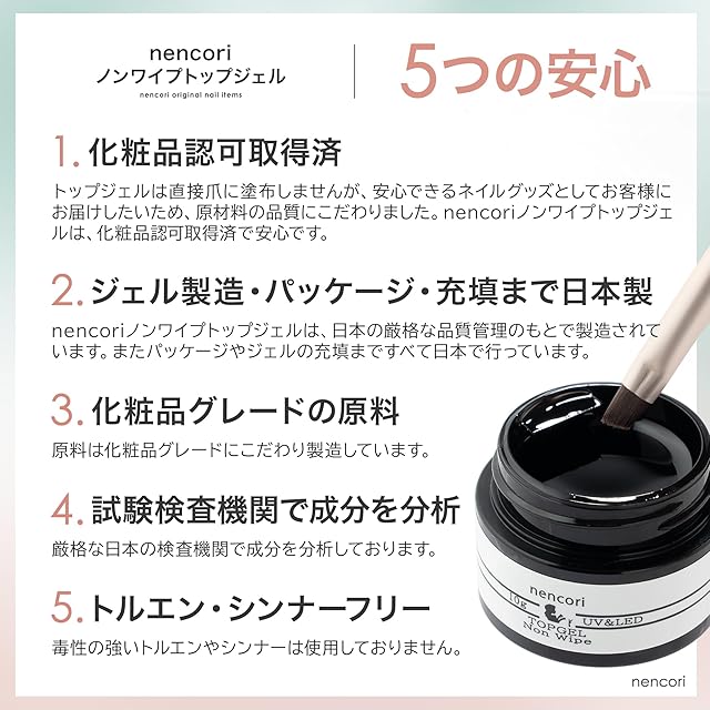 【日本で厳格な品質管理のもと製造】nencoriジェルネイルは、日本の厳格な品質管理のもとで製造されています。また、企画・パッケージ・充填作業に至るまで、すべて国内で行うことで高品質を実現しました。原材料の品質にもこだわっており、化粧品認可取得済で安心です。