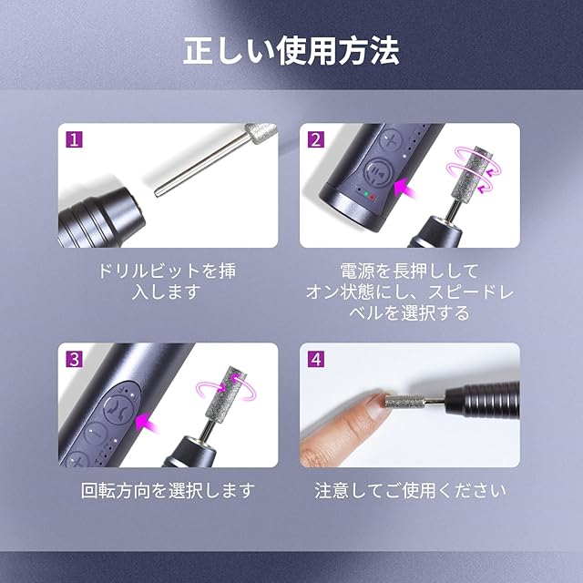 ネイルドリル:ペンのような形をしており、小さくて繊細なので持ち運びが簡単。交換用ドリル6本付き。本製品の電源には、過負荷や過熱から保護するチップが内蔵されています。ネイルドリルが作動しない場合は、電源を切ってリセットしてください。