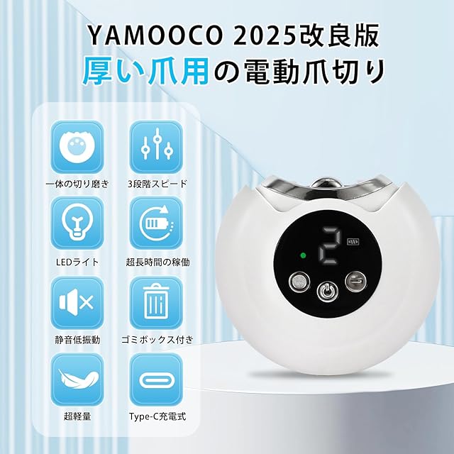 【LEDディスプレイ&三段階スピード】YAMOOCO新型両用爪切り爪研き爪削り3段階スピー、爪をローラー刃に押し当てて削るので簡単,最初のレベルは子供に推奨され、2番目のレベルは大人に適しており、3用途やシーンに合わせて強さを変更可能です。速度調整ギアがディスプレイに表示されます。
