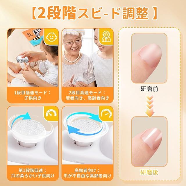 【2段階速度調節機能】爪切り 電動は2段階の速度調節が可能な爪切りです。電源ボタンを長押しでON/OFF操作、短く押すことで低速モードと高速モードを切り替えられ、ご利用シーンに応じた調節が可能です。お子様からご高齢の方まで安心してご使用いただけます。さらに安全ロック機能を搭載しており、爪磨きボタンと爪切りボタンを同時に2秒間長押しすると、数秒間動作が停止した後自動的に電源がオフになります。これにより、お子様が誤って操作してケガをしたり怖がったりするのを防ぎます。