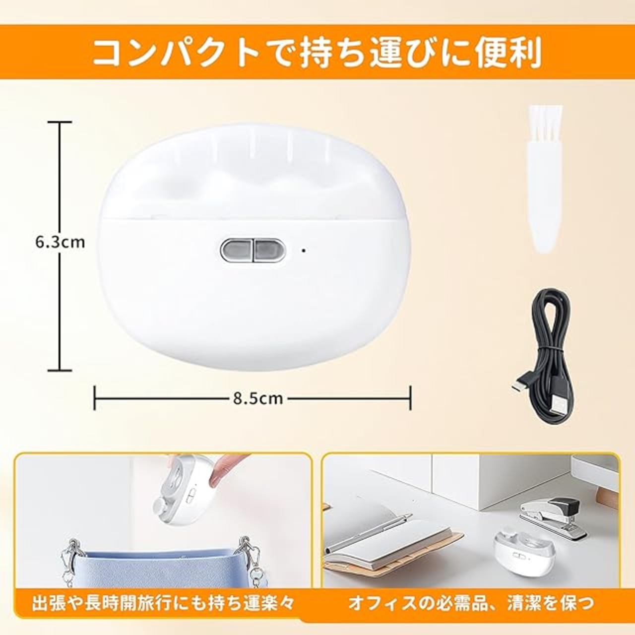 【削りカス自動収納&使いやすい】爪切り 電動は背面に収納ボックスがあり、爪切り後の爪を自動的に収納でき、爪の欠けが飛散するのを防ぎます。 また、「PUSH 」を長押しするとカバーが開き、爪を捨てることができます。 使い方も簡単で、保護カバーを外し、製品前面を上に向け、爪を穴に入れ、前後に動かして足裏を研ぎ終えます。片手で本体を持ち、研ぎ面を爪の表面と平行にし、爪やすりで爪の凹凸を調整する。