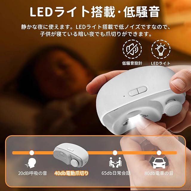 【Type-C急速充電&静音設計】この電動爪削りはType-C急速充電ポートを採用し、ほぼすべての充電ケーブルに対応します。500mAhの大容量バッテリーを搭載し、一度のフル充電にかかる時間はわずか2時間、フル充電後は約3時間使用できます。 充電中は赤いランプが点灯します。充電が完了すると緑のランプが点灯します。 (注意:充電が完了していない場合、使用感に影響が出る場合があります。また、電動爪切りは超静音設計で、40dB以下の低騒音で作動します。 お子様が寝ている時でも使用できます。