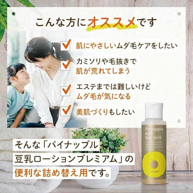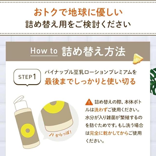 塗るだけムダ毛ケアローション「パイナップル豆乳ローションプレミアム」の通常ボトルの詰め替え用エコパックです。 容量は通常ボトルの10%増量、110mLで価格は変わらずお得になっています。 またボトルを買い直すより、プラスチックが約7割削減され環境にもやさしいです。 スマートに収納できて、詰め替え終わったらコンパクトに捨てられる『エコパック』は2本目以降の購入におすすめです。