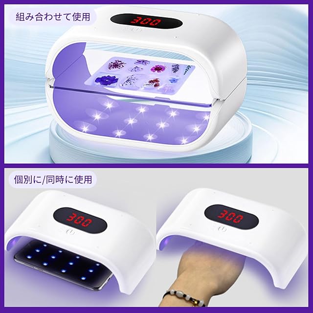 【2in1・同時硬化】上下を同時に均一に硬化できます。硬化時間は 2 倍に大幅に短縮されます。UVランプは着脱可能な設計となっており、分解して両手で同時に硬化することが可能です。ネイルサロンや個人的なDIYに非常に適しています <br>【速乾性・強力】ネイルアートランプは36W UV+LEDランプビーズと凸レンズを使用しており、短時間で効果的かつ一時的に硬化できます。 各種マニキュア、UVグルー、UV硬化レジン、UVレジンなどの硬化に適しています <br>【長時間設定】デジタル表示なので硬化時間が正確に分かります。2分、3分、5分の3つの硬化時間モードがあります。何度もモードを設定する必要がなく、一度で硬化できます <br>【使用方法】ネイルランプは2つの別々の部分で構成されており、強力な磁石で接続され、中央のベースで分離されているため、取り付けが簡単です。単独で使用する場合は別途電源が必要ですが、磁気接続すると単一のUSB-C電源で全体に電力が供給されます <br>【ご注意】ご使用前にアクリル板のフィルムを剥がしてください。 全体として使用する場合は、2 つの部分の磁気接続が正しく行われていることを確認してください