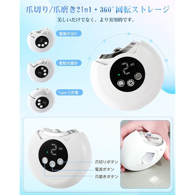 【爪切り/爪磨き2in1・360°回転ストレージ】この商品は電動爪切りと電動爪磨き2in1のデザインで、市販のほとんどの爪切りよりも便利です。360°回転ストレージ式設計を採用して、反時計回りに回転することで、爪切り、爪磨き、充電モードを調整できます。美しいだけでなく、より実用的です。爪切りは高品質の合金螺旋回転刃を使用し、電源を入れると45°高速回転し、アップグレードされた保護技術で指の安全を守ります。爪磨き機能は爪の形を整えるだけでなく、爪の表面を滑らかでピカピカになります。