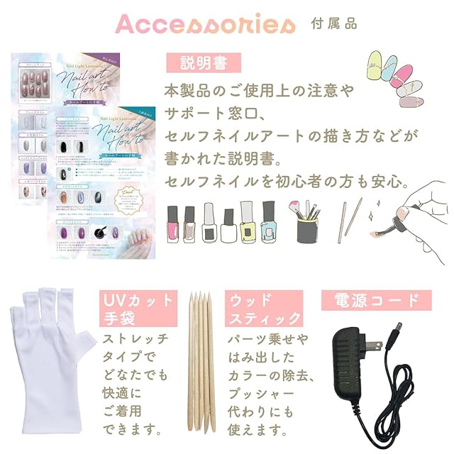 ?【充実の付属品】基本的なセルフネイルの工程からネイルアート見本まで付いたガイドブック、ネイルアートの必需品ウッドスティック(5本入り)日焼け防止手袋と充実のラインナップ!