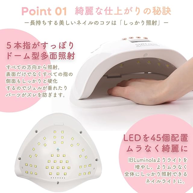 ?【ハイスペック】①45個のLEDライト、包むこむようなドーム型でムラなくしっかり照射が可能です。②手を出し入れするだけでON/OFFできる自動センサー、硬化熱を和らげるローヒートモード付き。③ボタン押すだけ!の簡単操作性