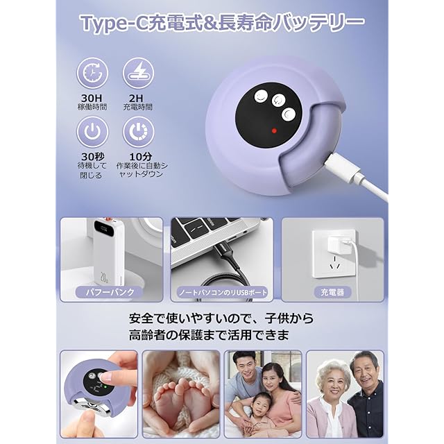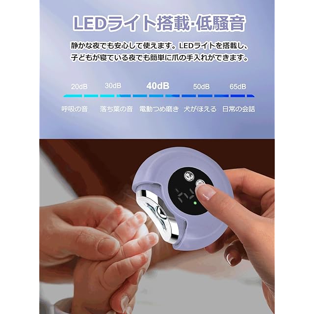 【3段階速度調節&高い安全性】この電動爪切りは、2段階の調速機能を備えており、速度調整ギアがディスプレイに表示されます。赤ちゃんの柔らかい爪は低速モード、大人や高齢者の硬い爪は高速モードで用途によって使い分けてお使いください。(また、この電動爪削りは安全ロック設計を採用しているので、子供が誤傷する心配もありません。)注意:爪削りを開くには、2つのボタンを同時に長押しする必要があり、爪切りが30秒静止すると自動的に閉じます、再びスイッチを押すと、使用を続けることができます。