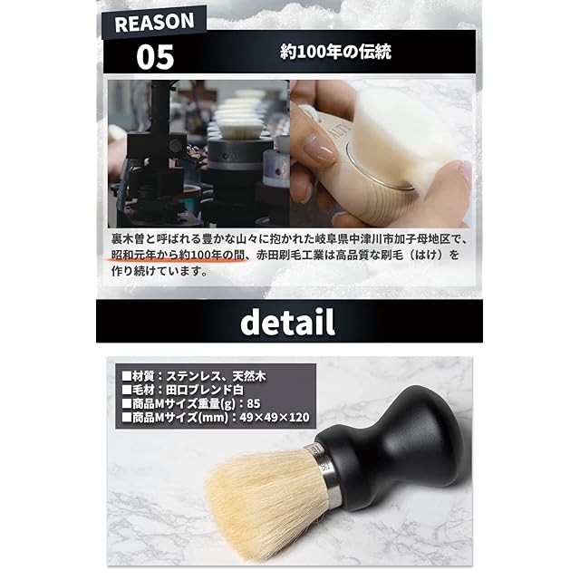 ✅【商品仕様】材質:ステンレス、天然木/毛材:田口ブレンド白/Sサイズ重量:55g、Mサイズ重量:85g/ Sサイズ:35×35×110mm 、Mサイズ:49×49×120mm