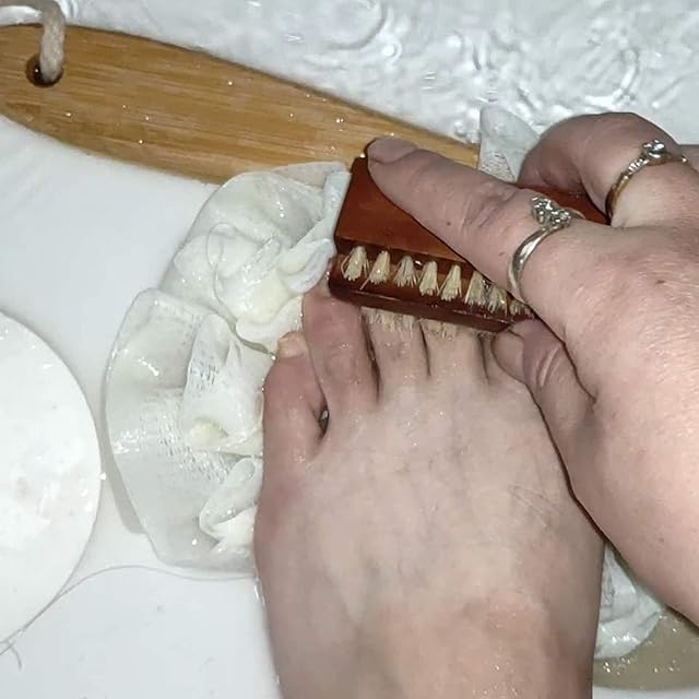 両面汚れあらい洗浄ブラシ: キューティクルや指の爪の下の汚れを取り除くための短い毛の狭い側と、より広い表面積のための少し長い毛の広い側で、足の裏と手のひらのクリーニングと角質除去に最適です。