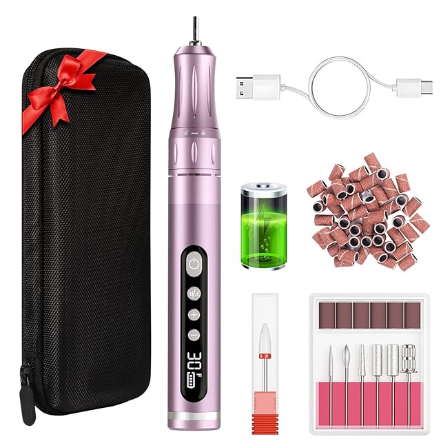【多機能ネイルマシン プロ用】 梱包内容: 1*ネイルマシン、6*ネイルドリルビット、30*サンディングバンド、1*収納袋、1*セラミックビット、1*取扱説明書、1* Type-C USB充電ケーブル。簡単に研ぐ、削る、切る、磨く、ジェルポリッシュやキューティクルをはがす、ネイルカービング、専門の技術者やネイル学生がサロンや自宅で使用するのに最適です。