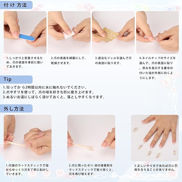 【パッケージ仕様】 ネイルチップ 10枚、爪用両面テープ24枚、ネイルリムーバースティック1本、爪やすり1個、マニキュアスティック1本も付いています!※サイズの測定方法と選択方法については、製品画像を参照してください。※最良の結果と再利用性のために、下記で推奨されているジェリーグルーを使用することをお勧めします。