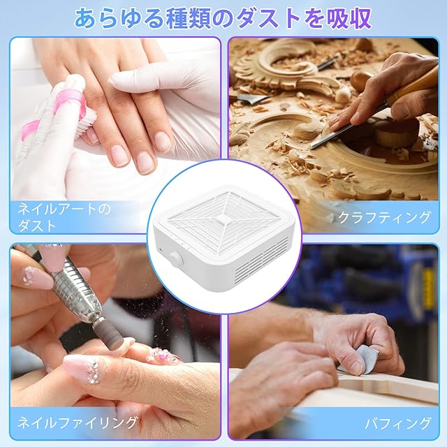強力なネイルダスト集塵機:CGBE集塵機 ネイルは、強力な120Wのブラシレスターボバキュームモーターが搭載されており、プラグインで使用可能です。最大速度は12000 rpmで、粉塵クリーニングに高い効率を発揮し、ジェルネイルの粉塵、アクリルネイルの粉塵、ディップネイルの粉塵などに最適なクリーナーです。