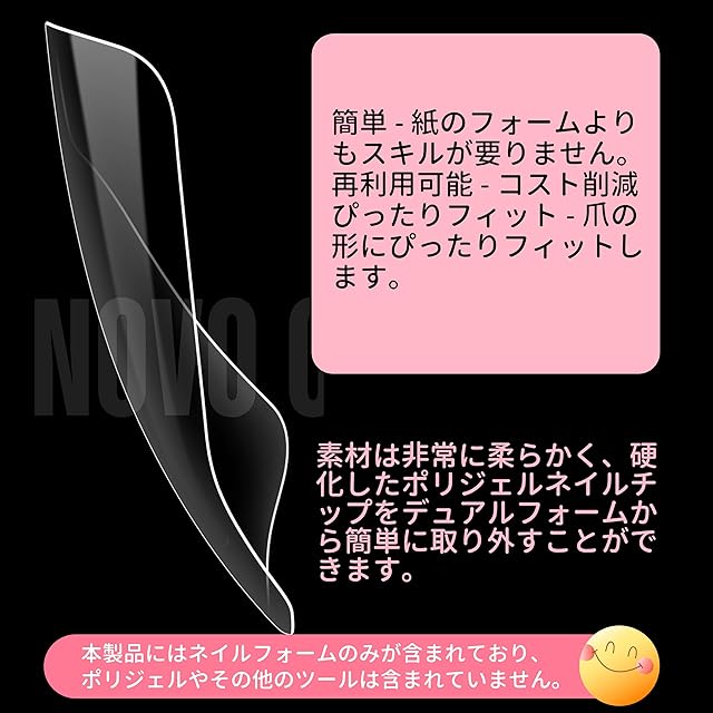 【 世界初のつま先用デュアルフォーム】ネイルアーティストやDIY愛好家にぴったりのNOVO OVOのつま先用デュアルフォームは、ポリジェルを入れて簡単に足の爪を作れます。硬化後は簡単に外せ、短い天然爪の方や適切なネイルチップを見つけにくい方に最適です。ロングネイルチップからハーフチップ、さらに自然なフィット感のあるデザインまで、幅広く対応します。