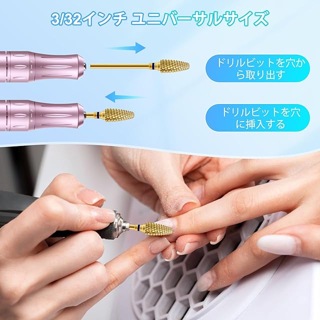 プレミアムタングステンカーバイド製ネイルビット オフ: 高品質なタングステンカーバイド素材で作られており、アクリルネイル、ハードジェルネイル、厚いエクステンションネイル、ビルダージェルネイル、そして天然ネイルの除去に十分な安定性と鋭さがあります。高品質な素材と厳密なテスト設計により、これらのネイルルータービットは摩擦と熱が少なく、過熱による肌の損傷を防ぎます