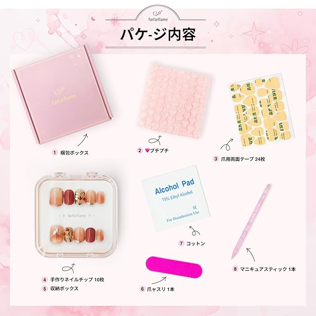 【パッケージ内容】10枚のネイルチップ、24枚の両面ネイルテープ、1本のネイルリムーバースティック、1本のネイルファイル、1本のマニキュアスティックも付きます!