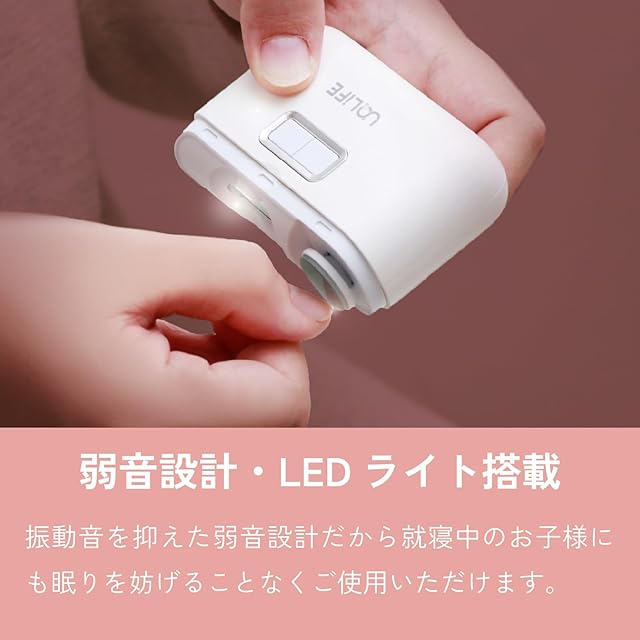 【弱音・LEDライト搭載】就寝時やオフィスなどの外出先でのご使用を考慮して、弱音設計にこだわりました。また、LEDライトによって、就寝中のベビーの爪のお手入れもいただけます。