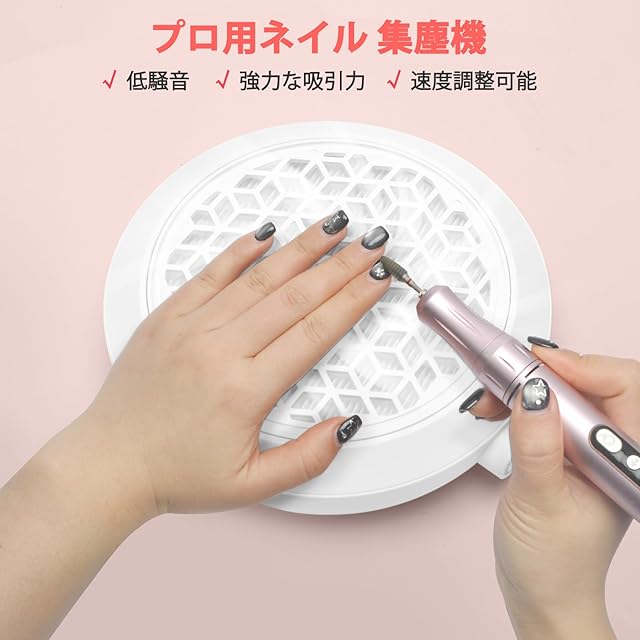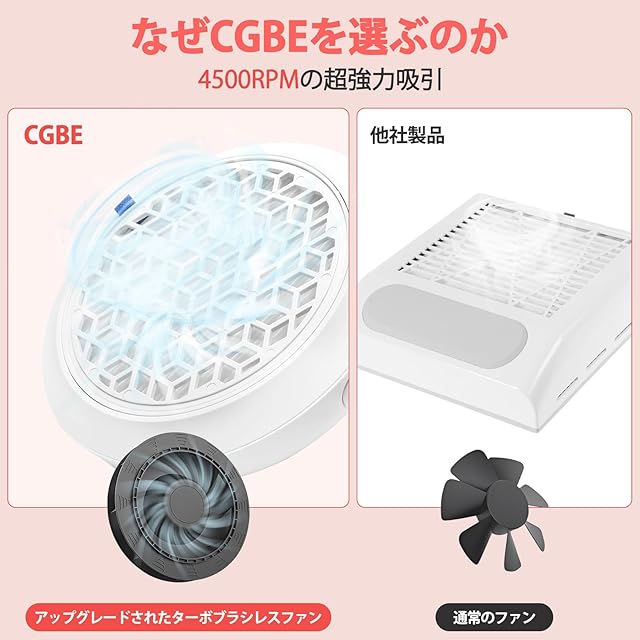 プロフェッショナルで強力な集塵機 ネイル:CGBEネイル 集塵機は、ブラシレスモーターを搭載し、4500 RPMで回転することで、驚異的な500PAの吸引力を発揮します。このネイルダストムは360度全方位からネイルダストや飛散した微粒子を効率的に吸着・収集します。ネイルのフィリングやポリッシング作業中でも、あなたとお客様が快適に呼吸できる環境を実現します