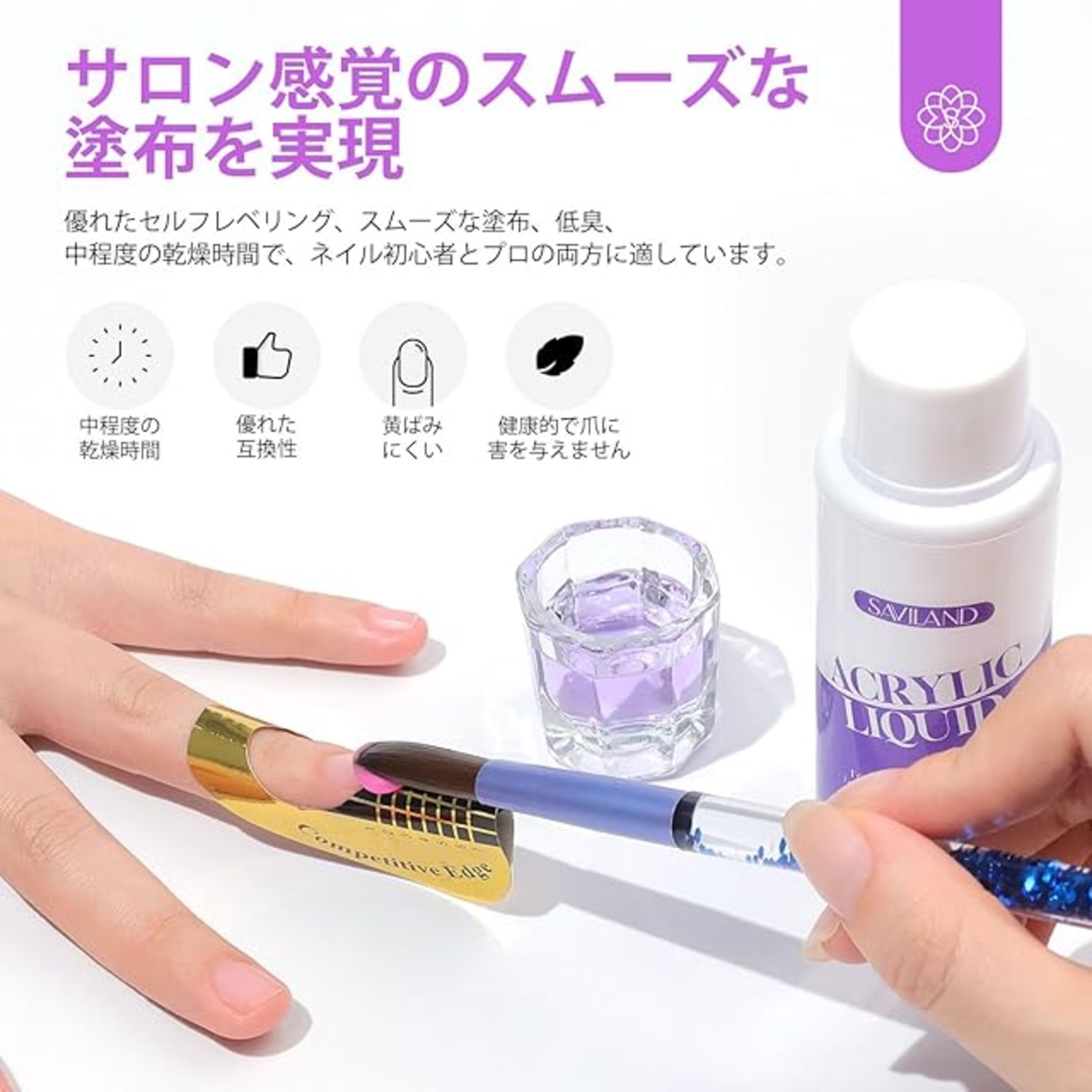 マストハブのアクリル リキッド & ヘルシー - アクリル ネイル用の Saviland アクリル リキッドは、完璧な一貫性、優れた接着性、気泡のない、優れたセルフレベリングを提供する健康的な処方を使用し、完璧な強度、耐久性、および柔軟性を備えています。色安定剤を配合し、アクリルパウダーの透明度を確保し、黄ばみや黒ずみを防ぎます。爪にも安心。約28日以上長持ちします。