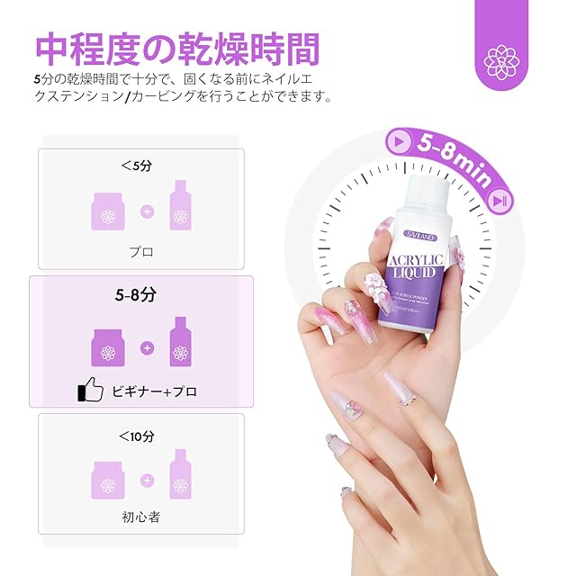 中程度の乾燥時間 - Saviland アクリル ネイル リキッドは、新しい健康的なフォーミュラを採用しているため、他の通常のアクリル ネイル リキッドよりも臭いが少なくなります。アクリルの塗布に最適な乾燥時間を確保し、約 5 ~ 8 分でアクリル パウダーを自然乾燥させます。これにより、アクリル ネイルを作成するのがはるかに簡単になり、ネイル エクステンション、ネイル カービング、接着ラインストーン ネイル アートを行うのに十分な時間があります。非常に適しています。ネイル初心者にもプロにも。
