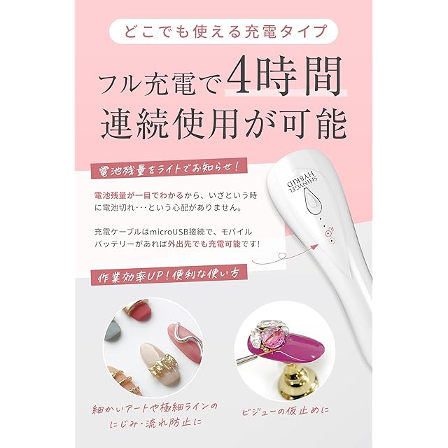 3Wから6Wにパワーアップ、UV+LEDハイブリッドモデルの新型ポータブルLEDランプです。<br /> <仮硬化のためのハンディ型LEDランプ><br /> 仮硬化したいとき、さっと手元で仮硬化できる便利な1台。複雑なアートの仮止め、ストーンやパーツの取り付けなど、ちょっとだけ硬化したいとき、大きなランプに何度も手を出し入れする必要がありません。<br /><br /> 手元ですばやく仮硬化するために、握りやすいハンディ型フォルム、片手で操作できるボタン設計、硬化したい箇所をピンポイントで照射できるなど、効率を重視した設計になっています。<br /><br /> また、ランプの出力が3Wから6Wにパワーアップ!波長は従来のLED波長(405nm)に加えて、UV波長(365nm)を追加し、UV+LEDのハイブリッドモデルになりました。<br /><br /> バッテリー内臓の充電タイプで、フル充電で約4時間の連続使用が可能です。充電式だから邪魔な配線はもう不要。コードレスでお使いいただけます。<br /><br /> 電池残量も一目でわかるデザインに。いざというときに電池切れ・・・という心配がありません。充電ケーブルはmicroUSB接続で、モバイルバッテリーがあれば外出先でも充電可能です。<br /><br /> <作業効率がアップする便利な使い方><br /> ・パーツやストーンの仮止めに<br /> ・細かいアートや極細ラインのにじみ、流れ防止に<br /> ・ジェルを塗って整えたフォルムをキープしたいときに<br /> ・ピンチング前の仮硬化に<br /><br /> ●仕様:消費電力:6W/電圧:5V/1A/バッテリー容量:2200mAh(リチウムイオン電池)