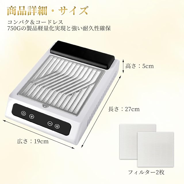 【充電式ネイル集塵機&ファインフィルター2枚】ネイル集塵機が大容量のバッテリー内蔵充電式です。4-5時間の充電で約70-80分間の連続使用が可能です。 コードレスだから設置場所を問わず、どこでもご使用可能で、とても便利です。ネイルダスト集塵機 が微細な粒子まで効果的にキャッチするプリーツ構造のファインフィルター2枚付属です。交換が簡単で、清掃して繰り返し使用することができます。天板とフィルターは取り外し可能。プロペラまでお手入れできますので、内部に入り込んだダストを取り除きやすく、清潔に保つことで本体が長持ちします。(吸引力が弱くなったと感じたら新しいフィルターと交換をおススメします)